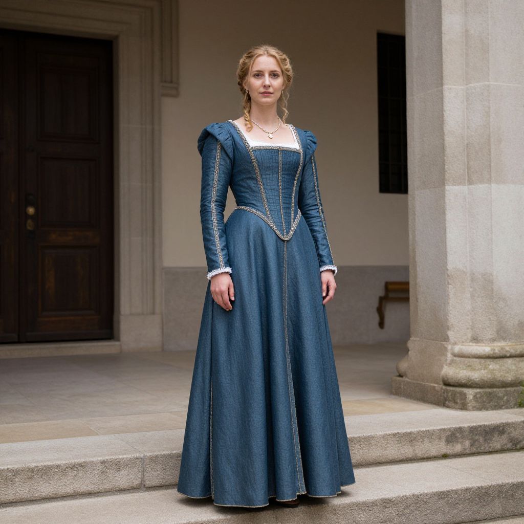 A photograph of a young Caucasian woman with light brown, wavy hair in a loose updo. She wears a long-sleeved, floor-length, blue denim gown with intricate silver embroidery along the bodice and neckline, and a white square neckline. The gown has puffed shoulders and a fitted waist. She stands in front of a stone building with a large wooden door to the left and a tall, gray column to the right. The background includes a light gray wall and a small wooden bench. The lighting is natural, highlighting the texture of the denim fabric and the stone architecture.