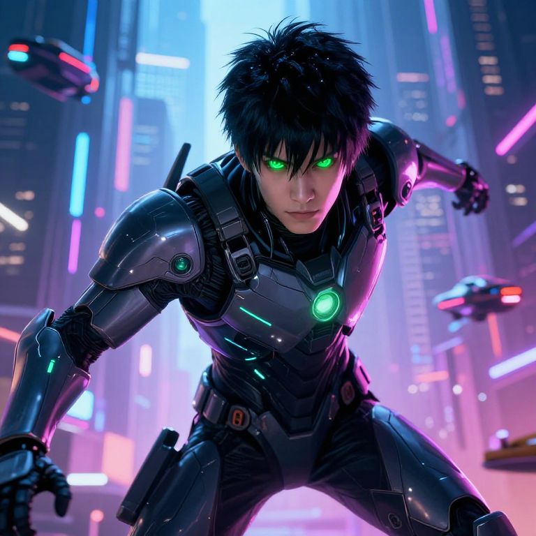 A digital CGI image of a futuristic, anime-style male cyborg with black, spiky hair and glowing green eyes. He wears a sleek, black, armored suit with glowing green accents, including a circular green light on his chest. His right arm is raised, and his left arm is bent, suggesting readiness or combat stance. The background is a neon-lit, cyberpunk cityscape with towering buildings and flying drones. The colors are vibrant, featuring blues, pinks, and purples, creating a high-tech, futuristic atmosphere. The image has a dynamic and intense composition, emphasizing the character's futuristic and combat-ready appearance.