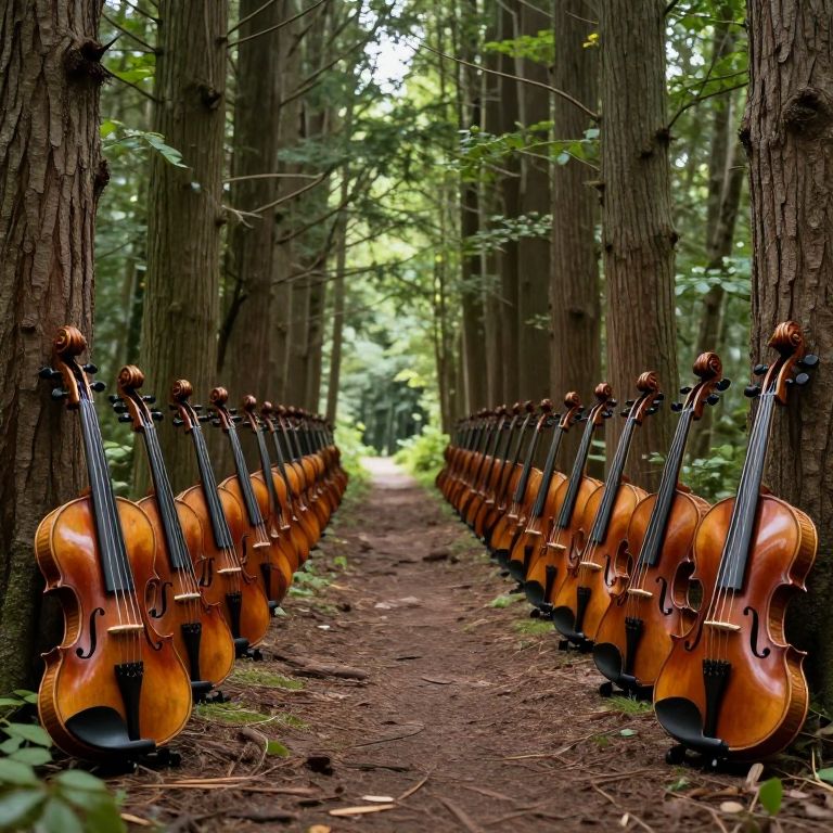 Rows of intricately crafted violins emerge seamlessly from the trunks of towering trees, lining a tranquil forest path where nature and music converge in a surreal, harmonious display.
