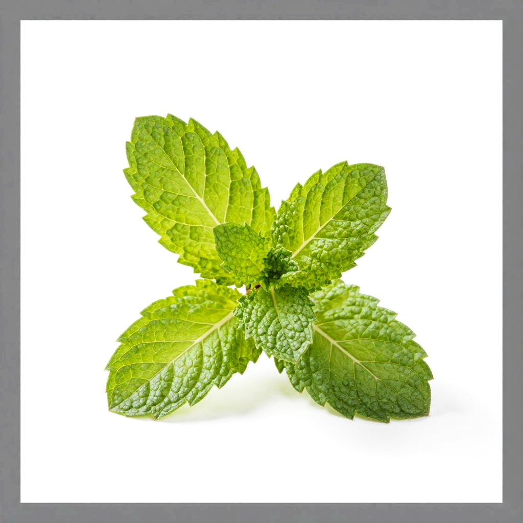 Photograph of a small cluster of fresh, vibrant green mint leaves with serrated edges and visible veins. The leaves are arranged in a slightly upward direction against a stark white background, creating a strong contrast that highlights their texture and color. The edges of the image are bordered by a solid gray color, adding a modern, minimalist feel to the image.