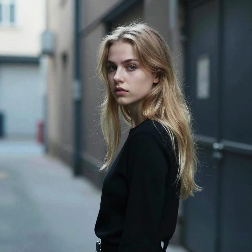 Photograph of a young Caucasian woman with fair skin and long, straight blonde hair standing on a city street. She has a neutral expression, wearing a light blue denim shirt with buttoned pockets and silver buttons. The background features a blurred, black-framed storefront and a parked red car on a street with a yellow dividing line. The buildings in the background are white with black trim, creating a contrasting urban setting. The image focuses on the woman's face and upper body, with a shallow depth of field highlighting her while blurring the background.