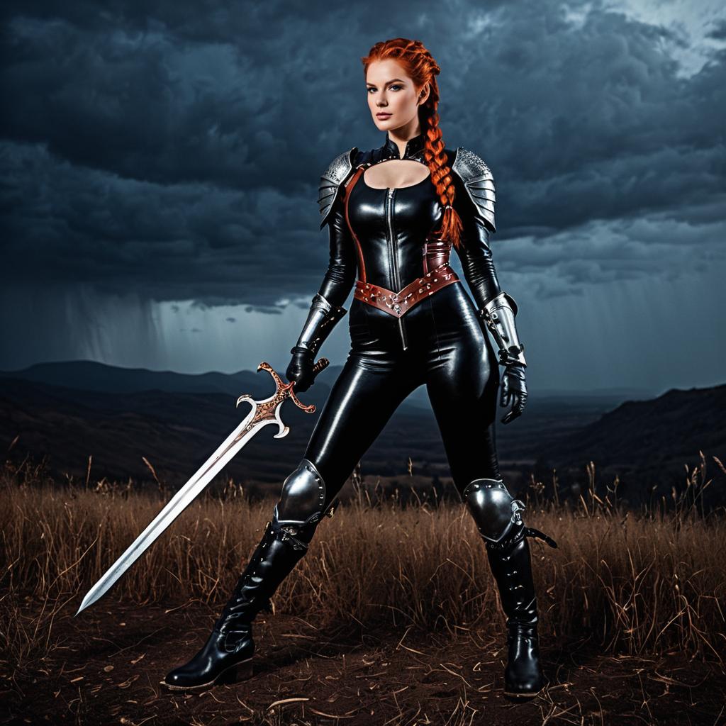 Athletic red-haired woman dressed in a black leather and latex catsuit with dark waxed leather armor and metal shoulder and knee guards, holding an ornate long sword. She stands confidently on a grassy battlefield with a stormy twilight sky in the background.