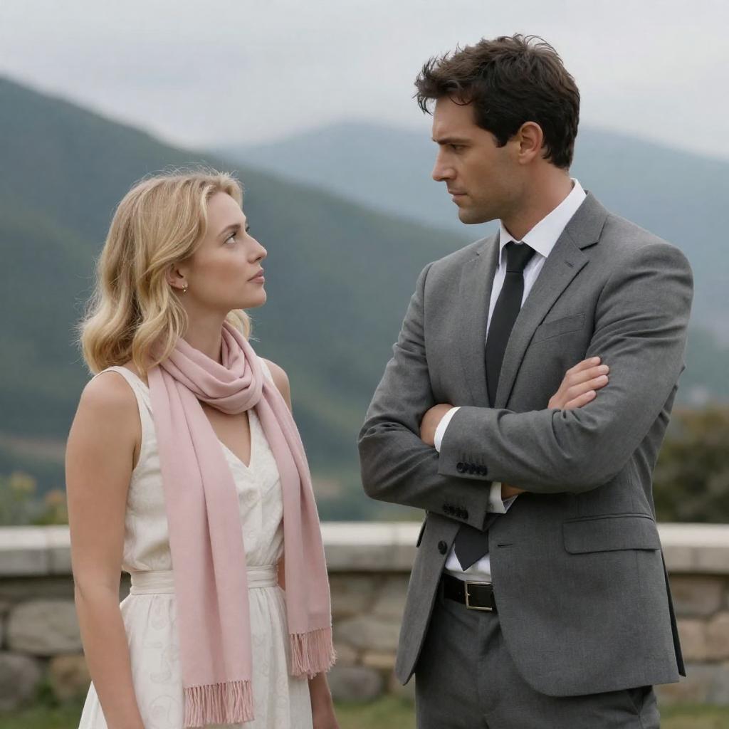 Photograph of a man and woman squatting on a concrete pavement. The man in a dark suit, white shirt, and gray fedora, with short dark hair, looks at the woman. The woman with blonde hair in a bun, wearing a beige trench coat, white blouse, and black heels, looks back at him. The background shows an overcast, grassy pavement.