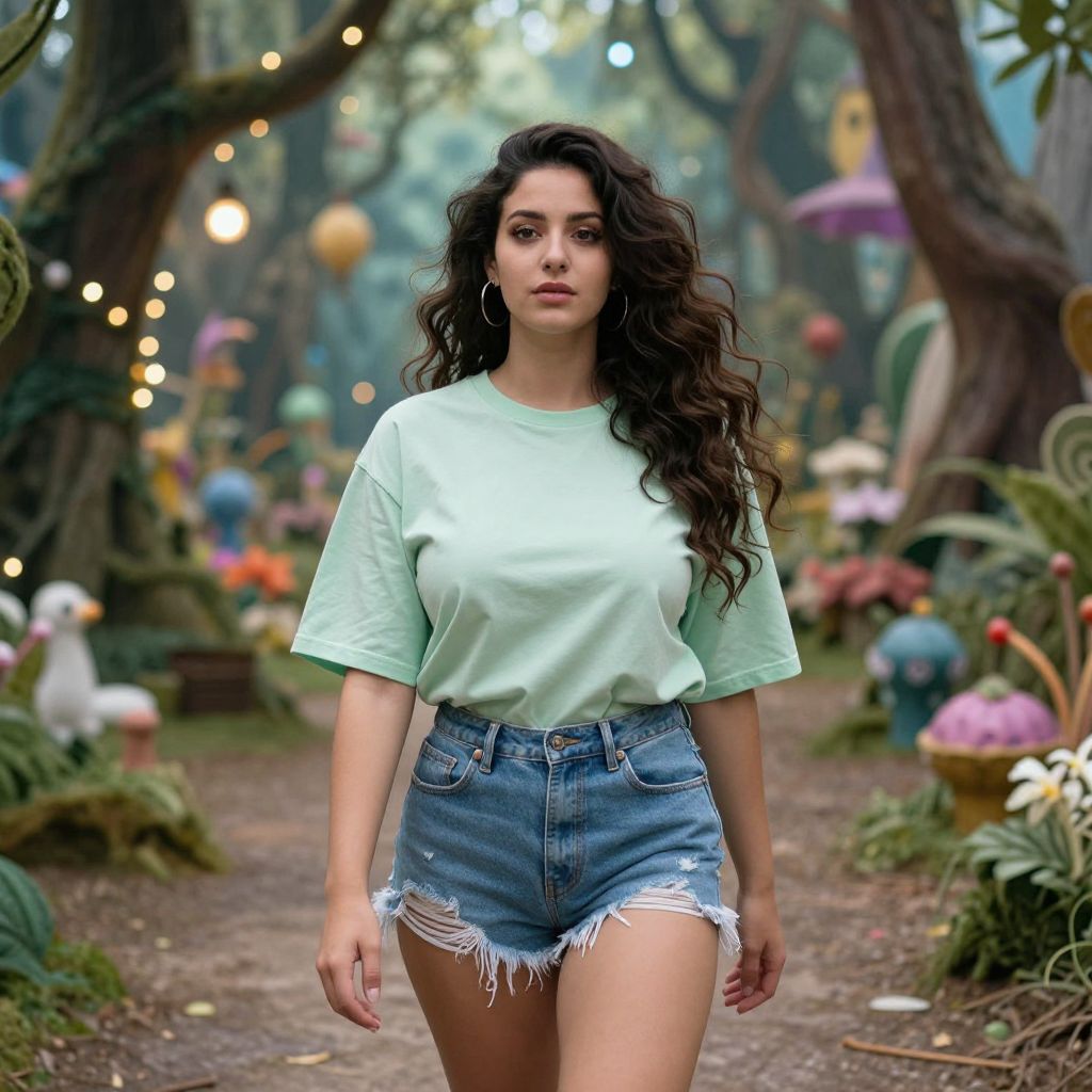 A Pear-shaped body type woman in casual streetwear, wearing an oversized pale green t-shirt and frayed denim cut-offs, strolls through a Wonderland forest path adorned with floating lights. The scene is captured in vibrant ib technicolor film stock, as she admires the enchanting surroundings, her long wavy hair flowing gently in the breeze. Sexy. Pretty face and beаutiful eyes. Big breasts