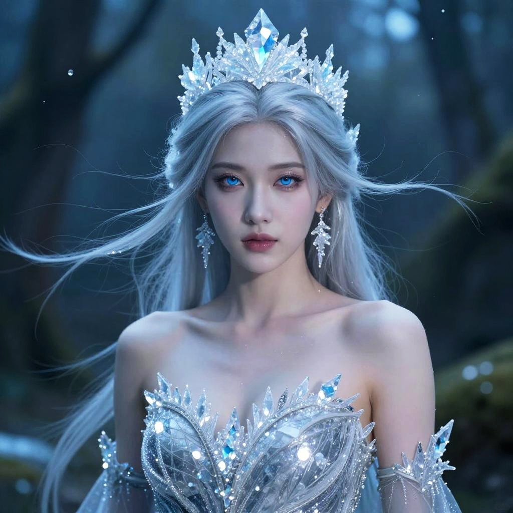 Ghostly wind dancer, with long flowing hair tangled with silver threads, sharp angular ears, radiant blue eyes, shimmering pale blue skin, surrounded by swirling mist, wearing light-reflecting feather cloak, detailed and atmospheric