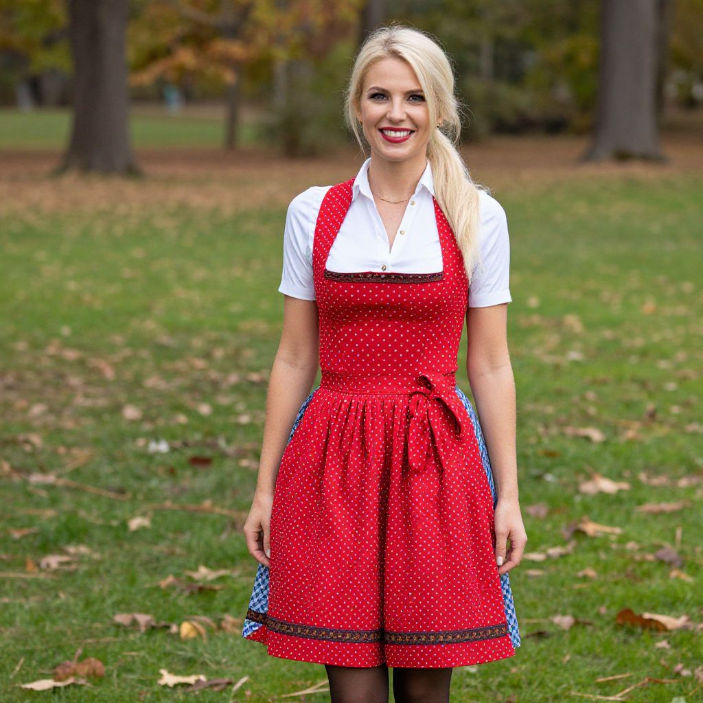 Blonde woman smiling brightly while wearing a vibrant red polka-dot Lanz Dirndl dress over a crisp white blouse, standing outdoors on a grassy lawn dotted with fallen autumn leaves.