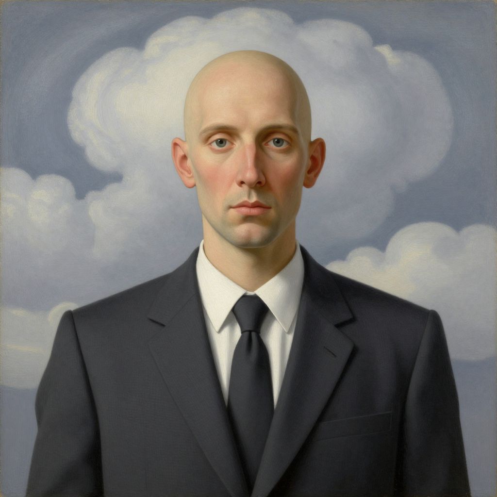 Portrait of headless man in a suit, clouds in the background, by rene magritte, detailed painting, distance, middle centered, hd, hq, high resolution, high detail, 4 k, 8 k