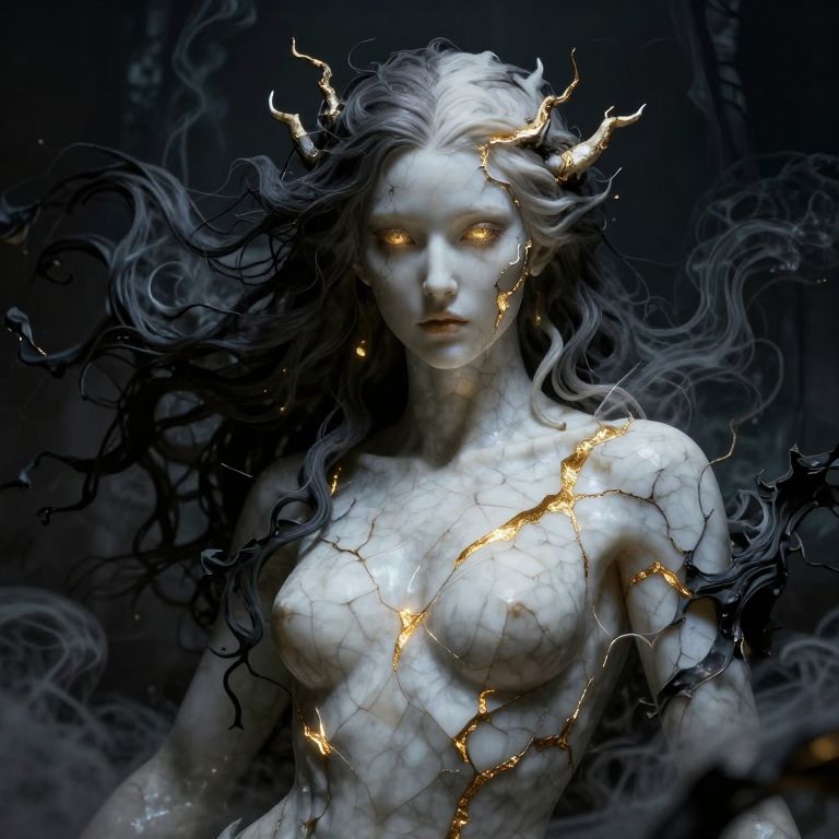 A mystical and powerful female figure crafted from cracked white marble, with glowing golden veins running through the cracks, Surrounded by dark flowing organic material resembling smoke or torn fabric, The atmosphere is dark and mysterious, illuminated by soft, ambient lighting that highlights her otherworldly appearance, Her piercing eyes glow faintly with golden light, and the environment reflects a mix of dark fantasy and cyberpunk aesthetics