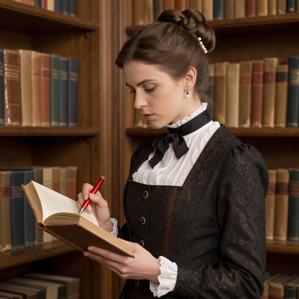A woman dressed in Victorian-inspired attire stands amidst wooden bookshelves, intently reading an open tome while holding a red pen poised above its pages, her hair neatly styled in a bun adorned with a pearl accessory.