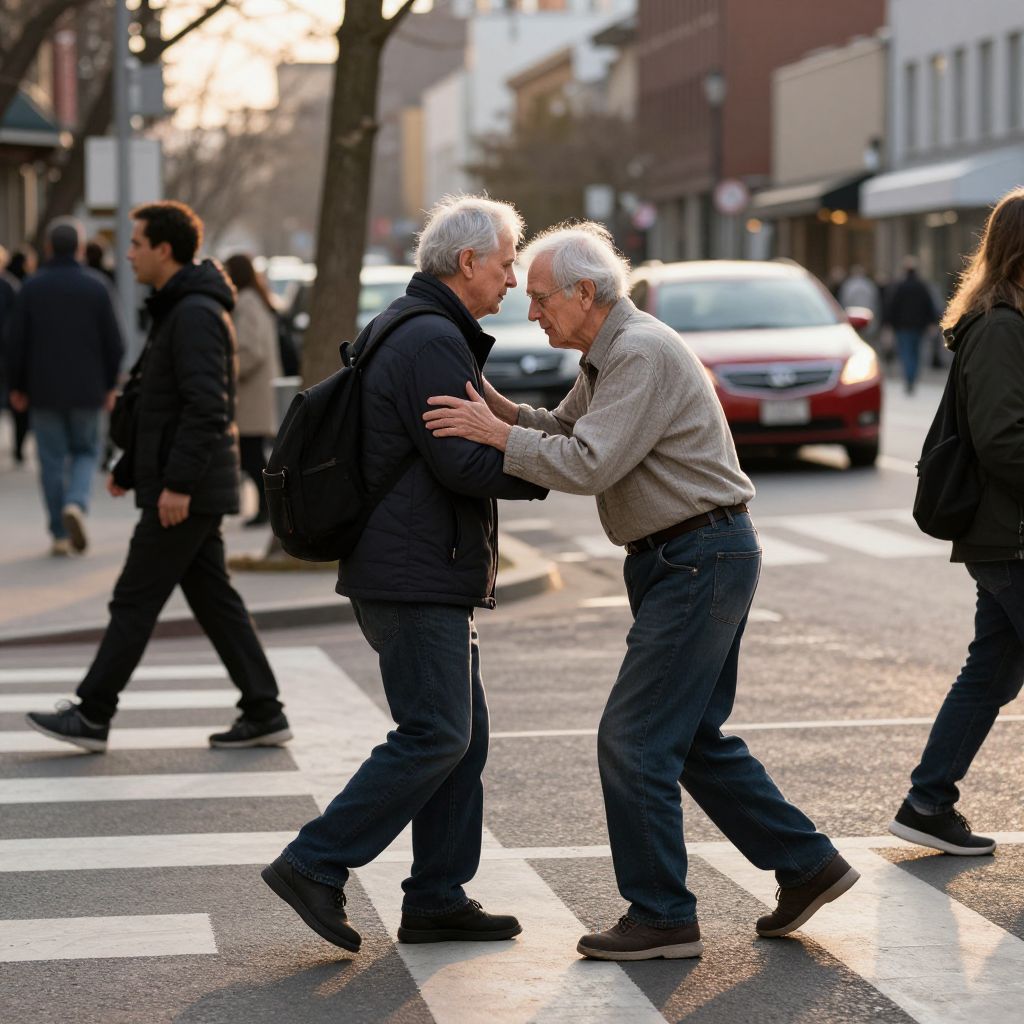 An urban scene showing a small good deed: a person helping an elderly cross a busy city street, warm golden hour lighting, realistic style with emotional expression on faces, emphasizing kindness and human connection in everyday life.