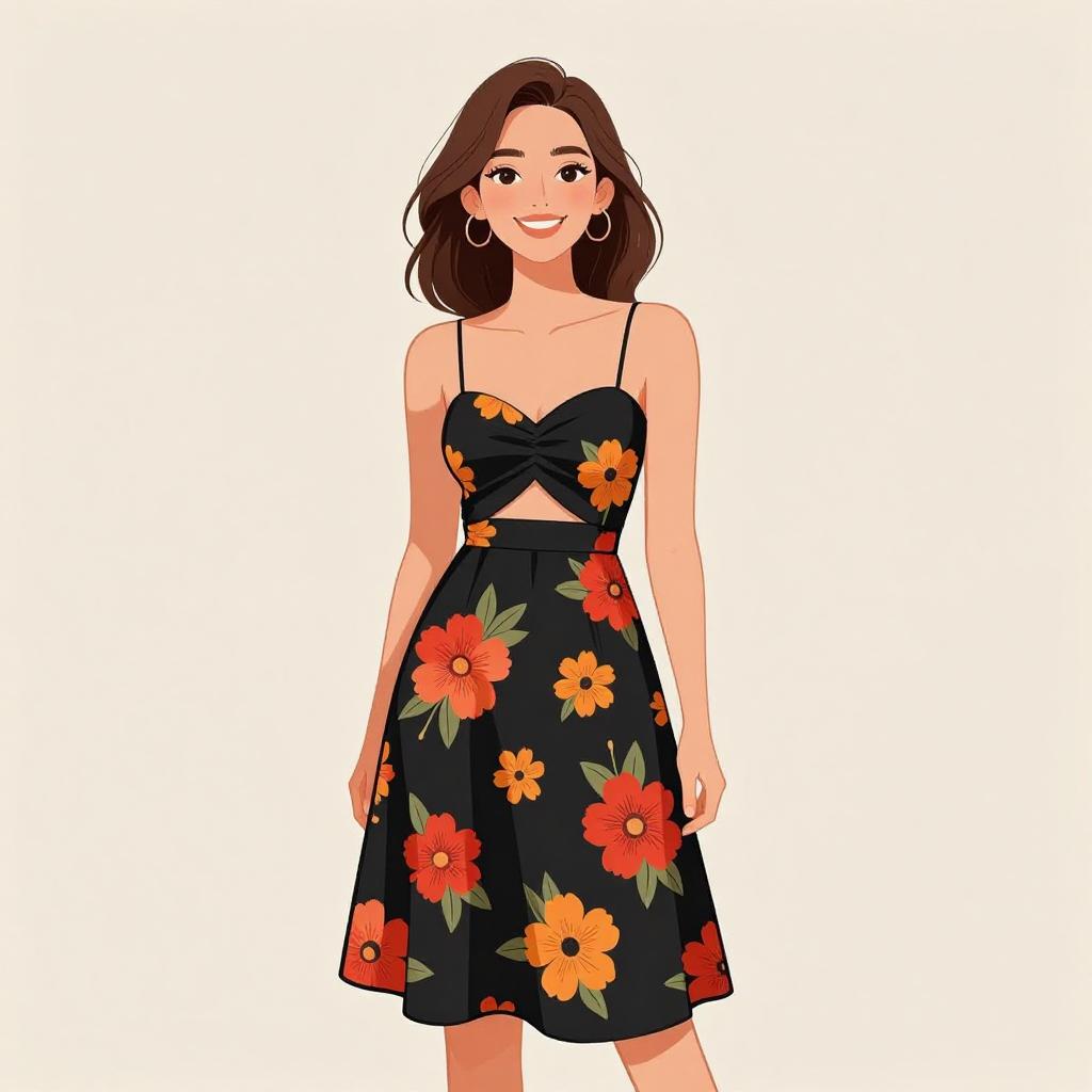 Woman with pretty face and pretty hair. smiling Woman, casual summer style, strapless A-line dress in black with a vibrant floral print featuring red and orange flowers, sweetheart neckline, front cut-out detail, knee-length hem, plain background with soft lighting. --sref 1467