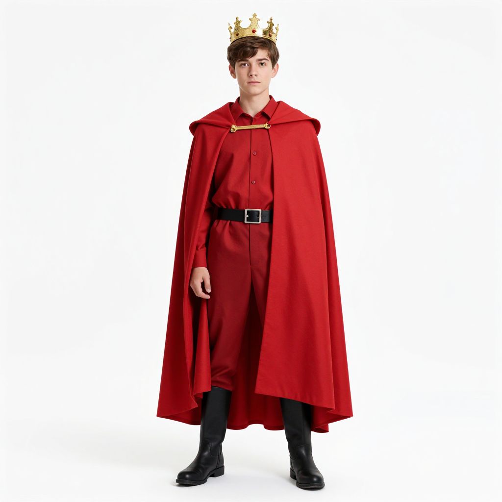 Red king cape costume, 1boy, solo, male focus, crown, cape, full body, boots, red cape, standing, white background, simple background, pants