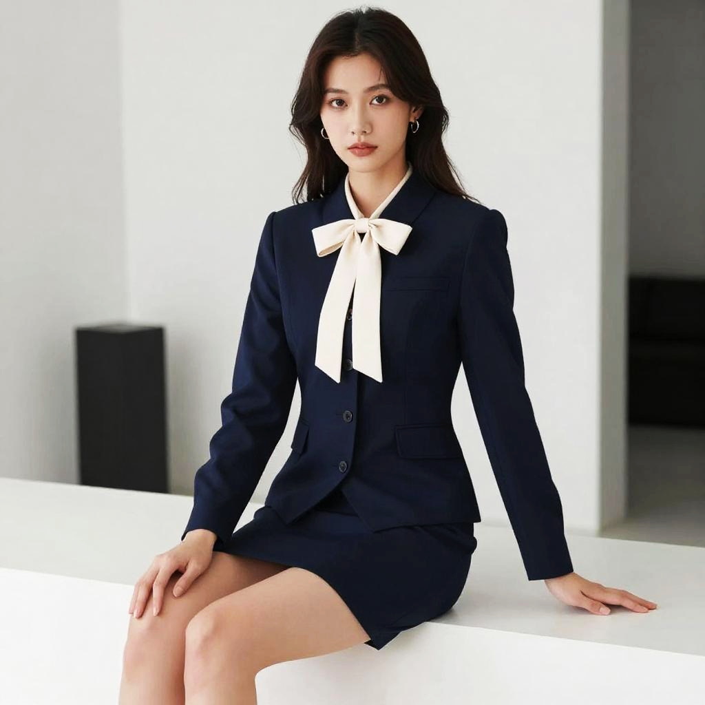 Young Asian woman sitting in a modern minimalist indoor setting, dressed in a navy blue business suit with a white prominent bow tie. She has long dark hair and wears small hoop earrings. The outfit includes a fitted blazer and a matching skirt, conveying a sophisticated and professional style.