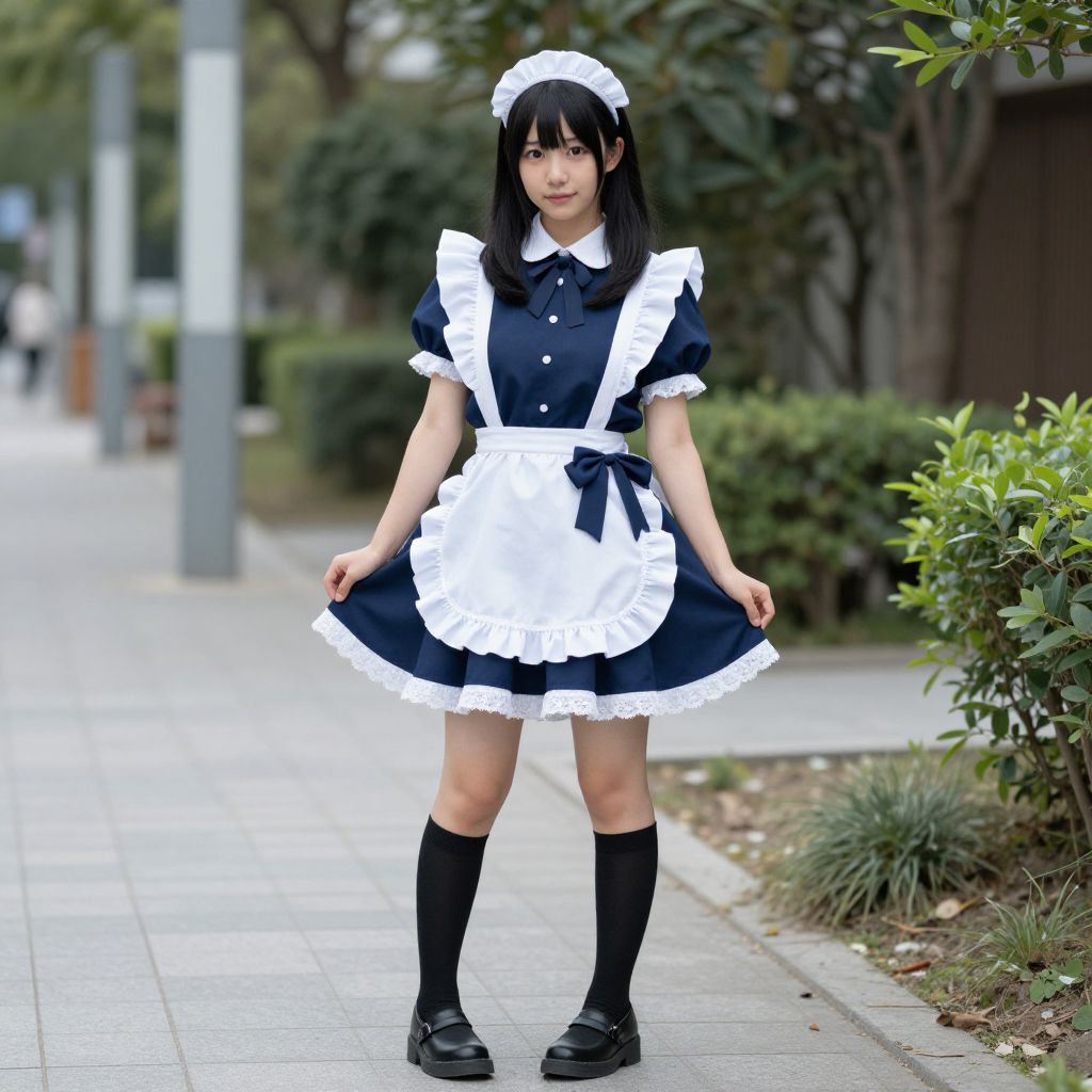 Misaki Maid Costume, woman in a maid outfit standing on a sidewalk