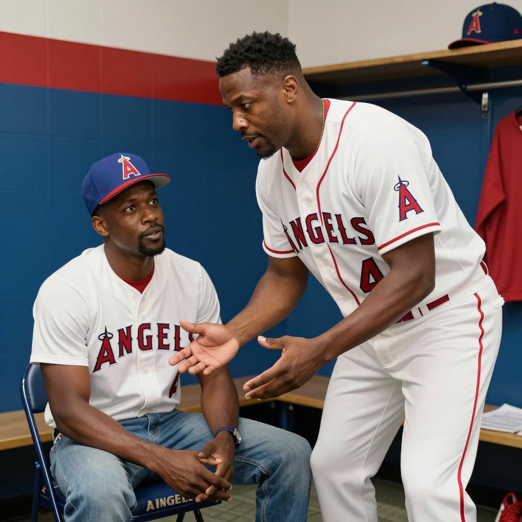 Photograph of two African American men in a locker room. Man on the right, wearing a white baseball uniform with red "A" on the sleeve and number 4, leans forward, gesturing with hands. Man on the left, wearing a white T-shirt, blue jeans, and a blue baseball cap with red and white , sits on a chair labeled "ANGELS". Both men have intense facial expressions. Background includes a wall with red, white, and blue stripes, and a desk with papers.