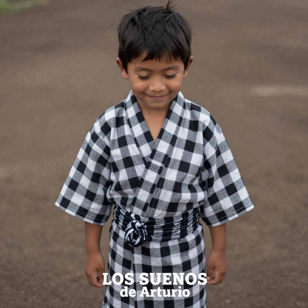 Photograph of a young Asian boy with short black hair, wearing a black and white checkered kimono, standing on brown dirt. He smiles slightly, eyes closed, with hands by his sides. Background is blurred dirt. Bottom reads "LOS SUENOS de Arturo."