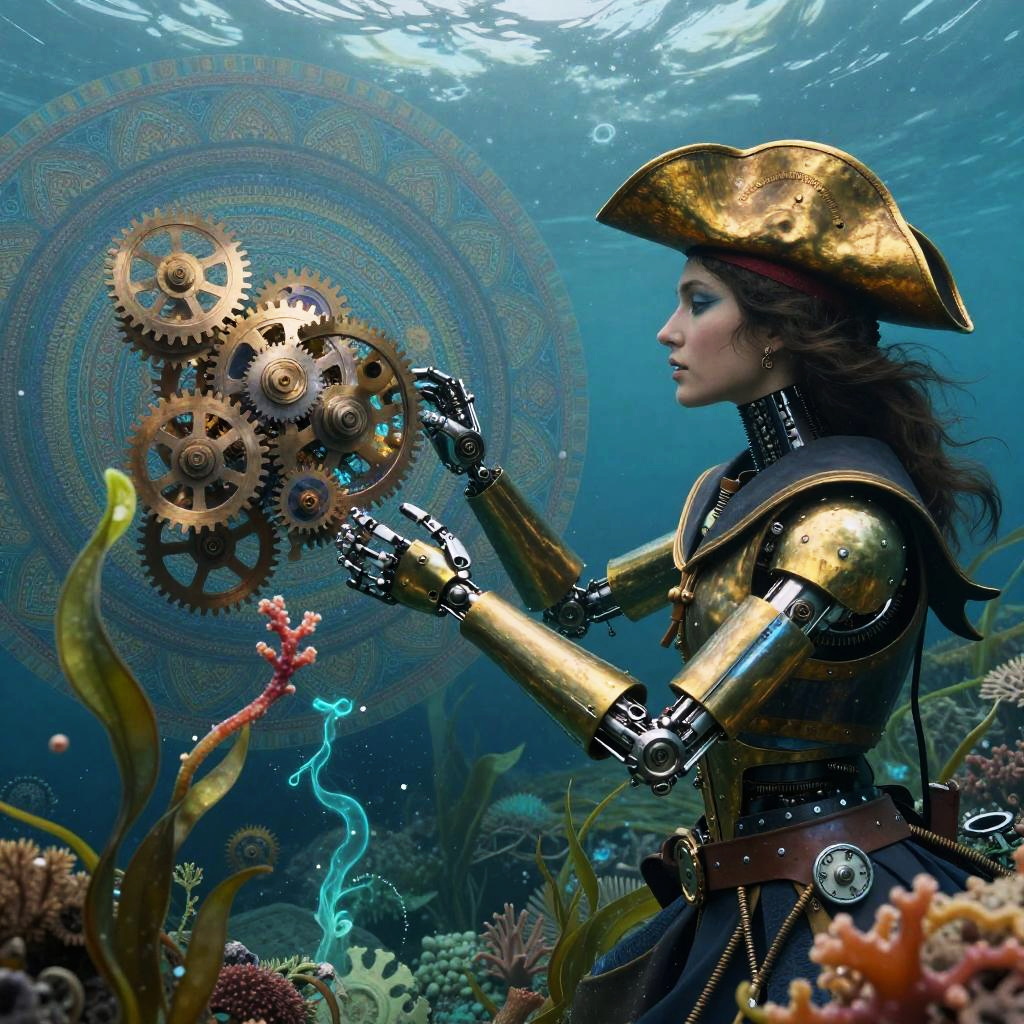 A clockwork mariner wearing a brass tricorn and mechanical coral limbs on a psychedelic journey, witnessing herself unspooling into tidal clockwork gears woven from light and living kelp, adrift in a vast chaotic ocean of tessellated mandalas and phosphorescent currents. She merges with the water, experiencing unity with the universe, perceiving existence from countless viewpoints.