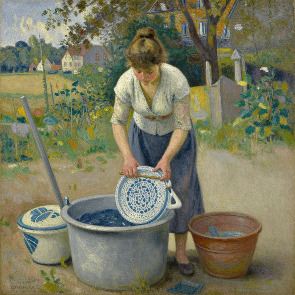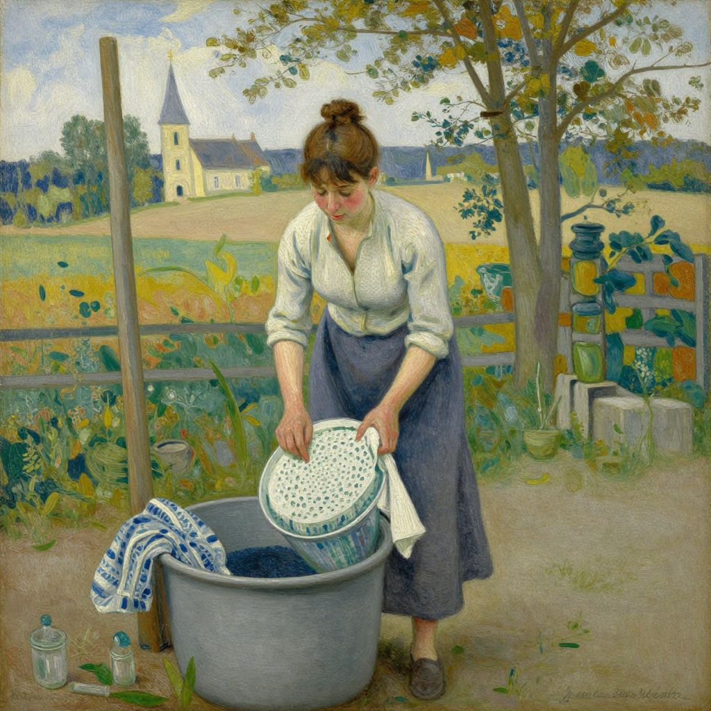 Painting of a woman in a white blouse and blue skirt, washing laundry in a gray bucket, rural countryside background, church steeple visible.