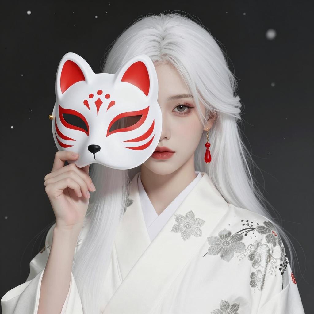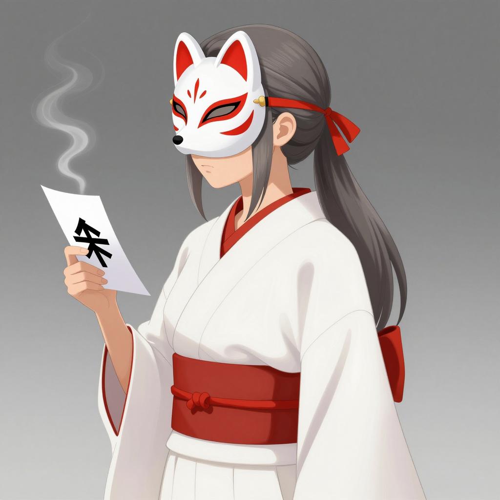 Illustration of a woman with long, wavy gray hair, wearing a white fox mask with red markings, looking over her shoulder. Red circle background. She is draped in a loose, gray cloth. Black hair tie. Gray ured paper.