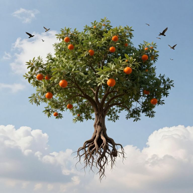 A surreal tree floats serenely in the sky, its roots suspended in mid-air like delicate tendrils, while vibrant orange fruits dangle from its branches, attracting flocks of birds that soar amidst fluffy white clouds.