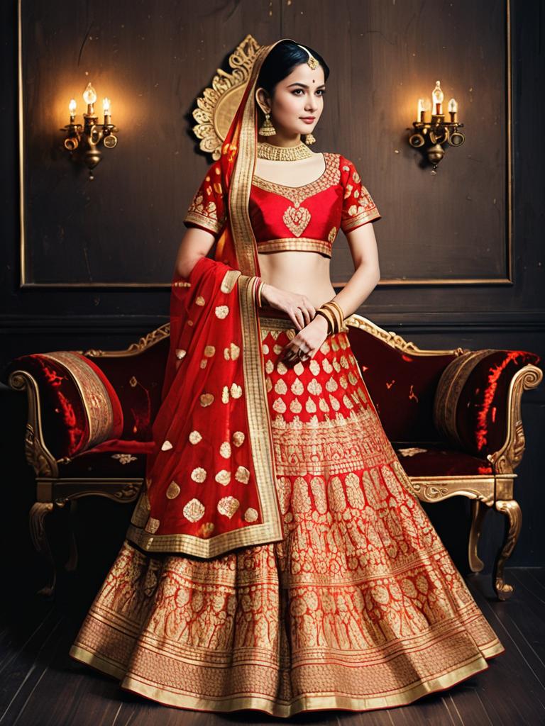 Silk Wedding Lehenga Choli, a woman in a red and gold lehen with a red and gold lehen --sref 1399