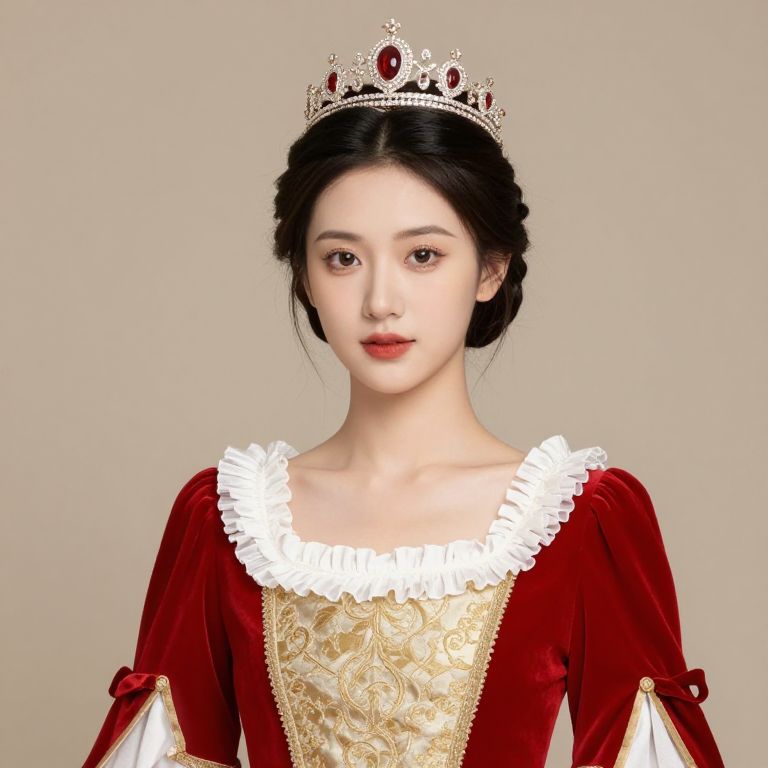 Female wearing a red and gold dress with a white ruffled collar and a crown on her head.