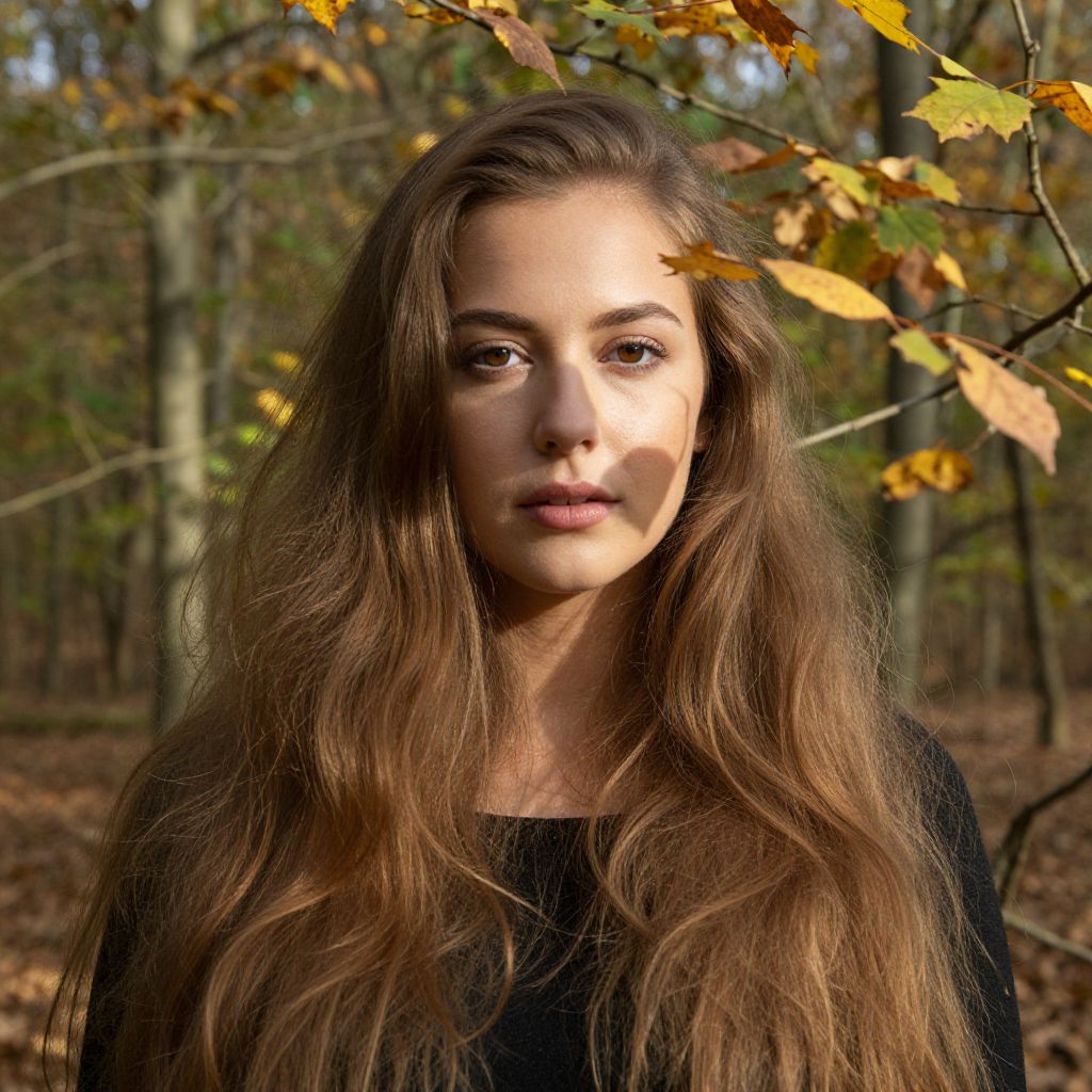 Photograph of a young woman with long, wavy brown hair and light skin, standing in a forest during autumn. She has dark, slightly arched eyebrows, brown eyes, and a neutral expression. She wears a black top, and sunlight filters through the yellow and brown leaves above her, casting dappled shadows on her face. The background is blurred, showing tall trees and a forest floor covered in fallen leaves. The image has a warm, natural light, highlighting the autumnal colors and her soft, flowing hair.