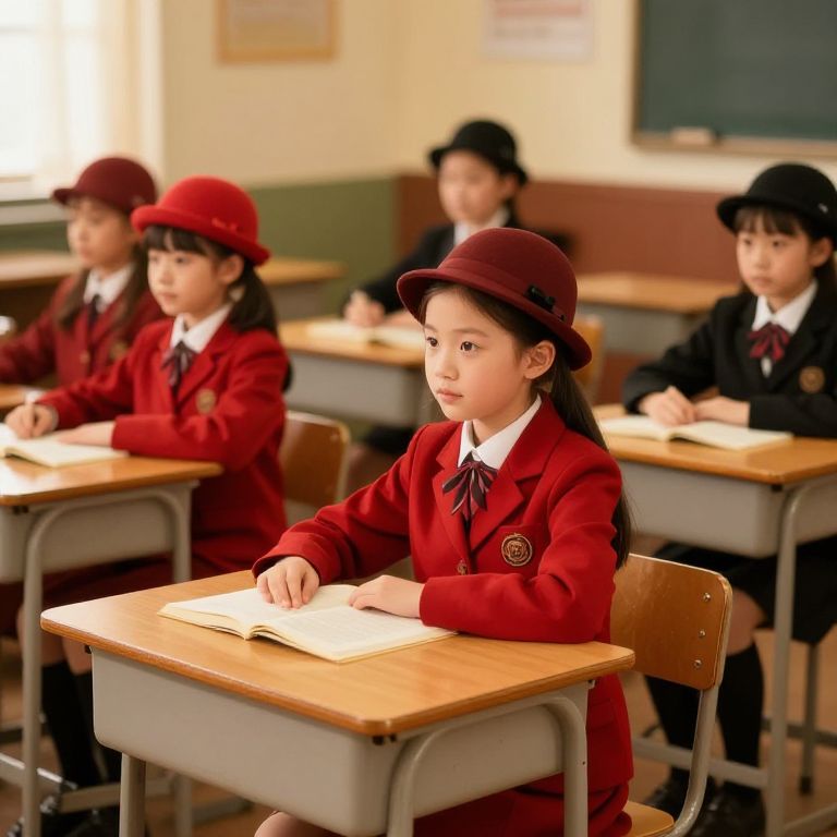 Girls suit prompt: A cozy classroom setting where girls in classic red and black suits sit at desks, wearing small hats and holding books, with warm lighting and vintage desks, evoking a nostalgic, educational environment.