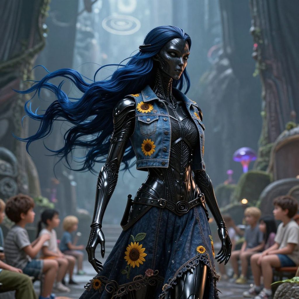 (Quirky Alien Landscape:1.3), (A mesmerizing woman crafted from black metal:1.2), (her silhouette sleek and formidable, with a surface that catches the light with a subtle, enchanting luster), (features finely wrought, suggesting both strength and elegance, her presence commanding yet ethereally graceful) (with extremely long flowing Midnight Blue Dark Blue hair, wearing Embroidered sunflower jean jacket with a prairie dress:1.2), (Teaching banned subjects to children in secret:1.3), UHD, 4k, anime, highly detailed face, cinematic, hyper realistic