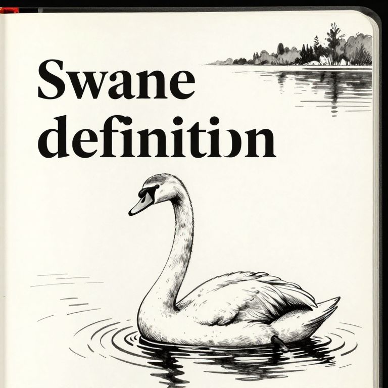 Artistic interpretation of 'Swane definition' featuring a minimalistic black and white ink drawing of a swan beside the word, clean serif font definition text, high contrast shadows, serene lake background with gentle ripples, subtle vintage notebook style.