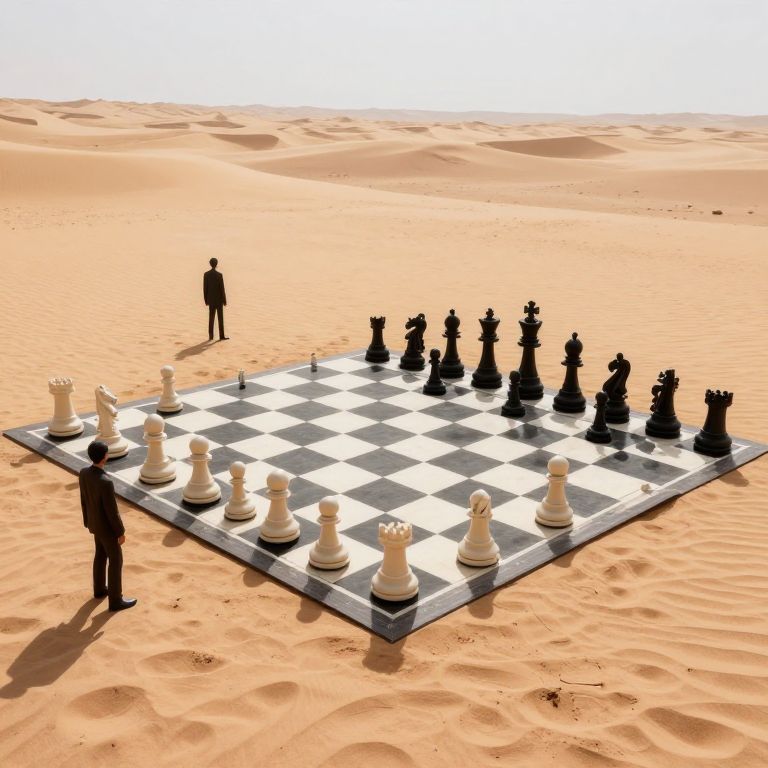 A colossal chessboard stretches across a desolate desert, where faceless figures stand motionless beside towering pieces, casting long shadows in a surreal tableau of strategy and solitude.