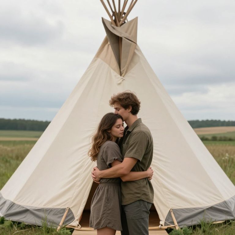 Rachel and Ed embrace tenderly in front of a large, cream-colored tipi tent, set against a serene rural backdrop with open fields and a cloudy sky.