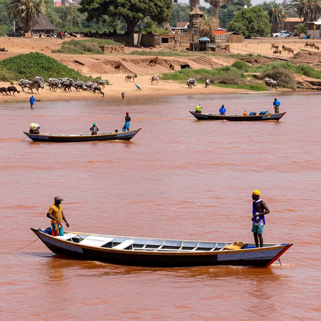 Nile River turning red amid a natural phenomenon, red-hued water flowing past bustling river life, fishermen in traditional boats, exotic wildlife along the banks, bright daylight, photorealistic texture and colors