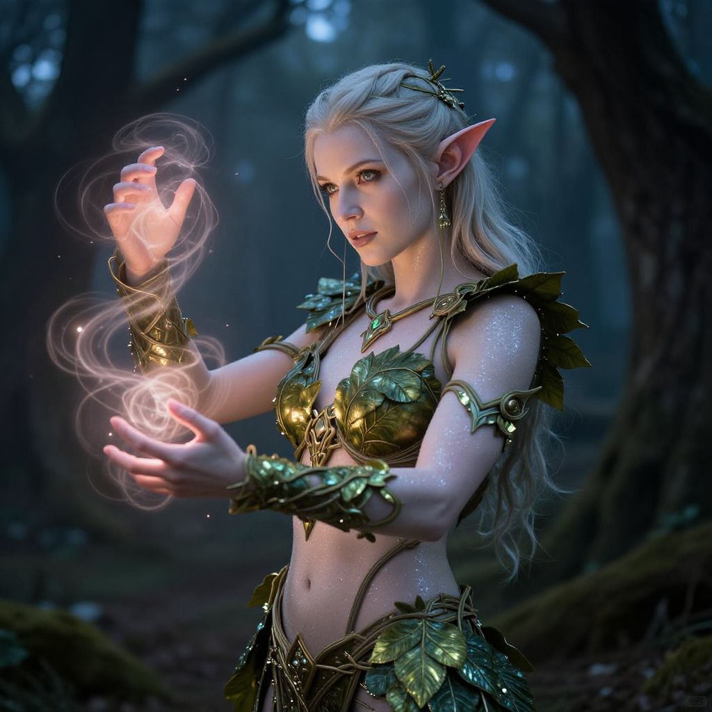 Dynamic portrait of a female eladrin with delicate pointed ears and shimmering pale skin wearing elegant armor crafted from leaves and vines. She is standing in a twilight forest with mystical light filtering through ancient trees. Magical energy swirls around her hands, enhancing the fantasy atmosphere.