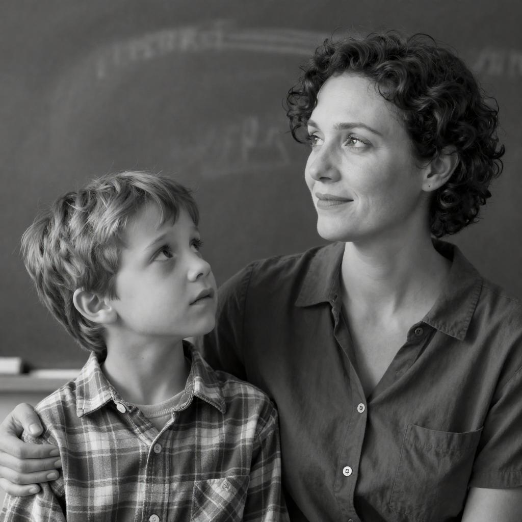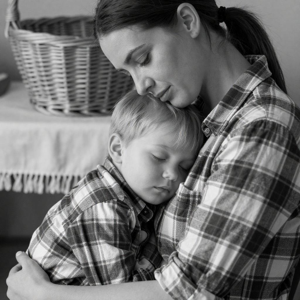 Black and white photograph of a man and young boy indoors. Man leans forward, kissing the boy's hand. Man has short dark hair, wearing a collared shirt. Boy has short dark hair, wearing a sweater with visible stitching. Background shows blurred window with foliage outside. Man's face is partially obscured by the boy's hand. Boy's expression is neutral, man's expression is not visible. Man's right hand is on the boy's arm.