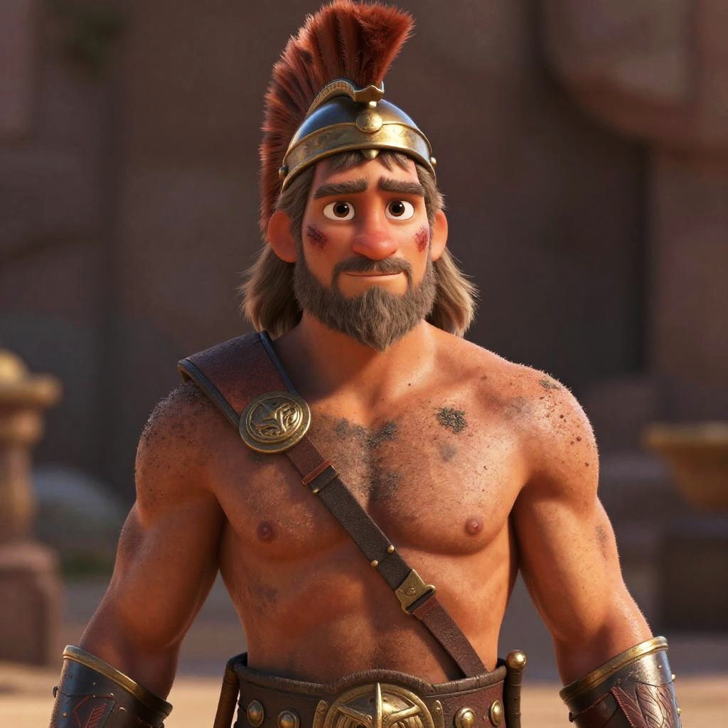 ((pixarstyle)) a waist-length portrait of a spartan male, warrior, dirt, scars, grunge, bare chest, natural skin texture, 4k textures, hdr, intricate, highly detailed, sharp focus, cinematic look, hyperdetailed