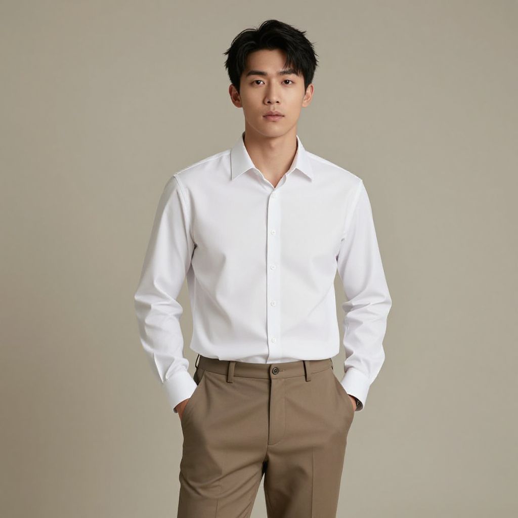 Photograph of a young Asian man standing against a plain, light grey background. He has short, black, slightly tousled hair and a neutral expression. He is wearing a crisp, white, long-sleeved dress shirt with the collar open, and brown, slim-fit trousers with his hands casually in his pockets. The lighting is even, highlighting the clean, simple lines of his outfit. The overall style is modern and professional, with a minimalist aesthetic.