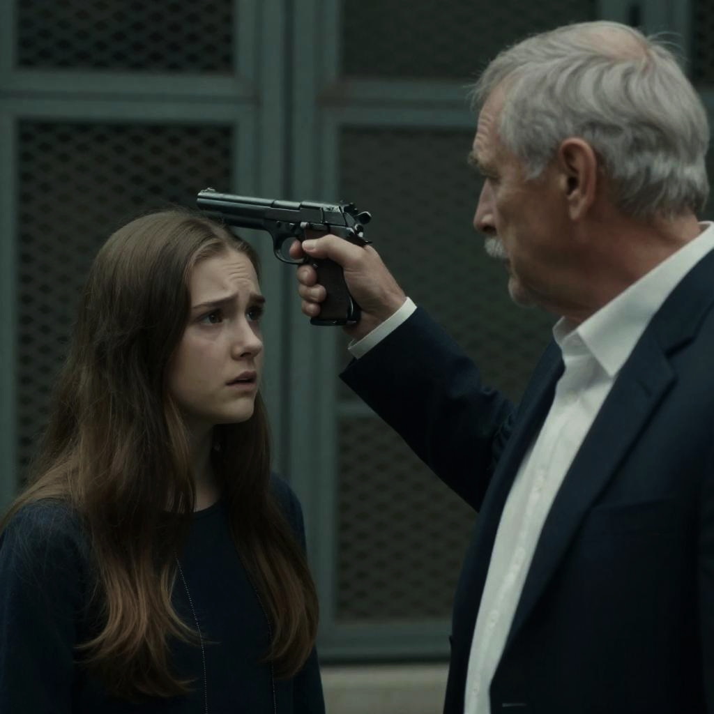 Photograph of an older man with white hair and a mustache, holding a gun to a young girl's head. Girl has long brown hair, scared expression. Man in dark suit, white shirt, greenish lighting, metal mesh background.