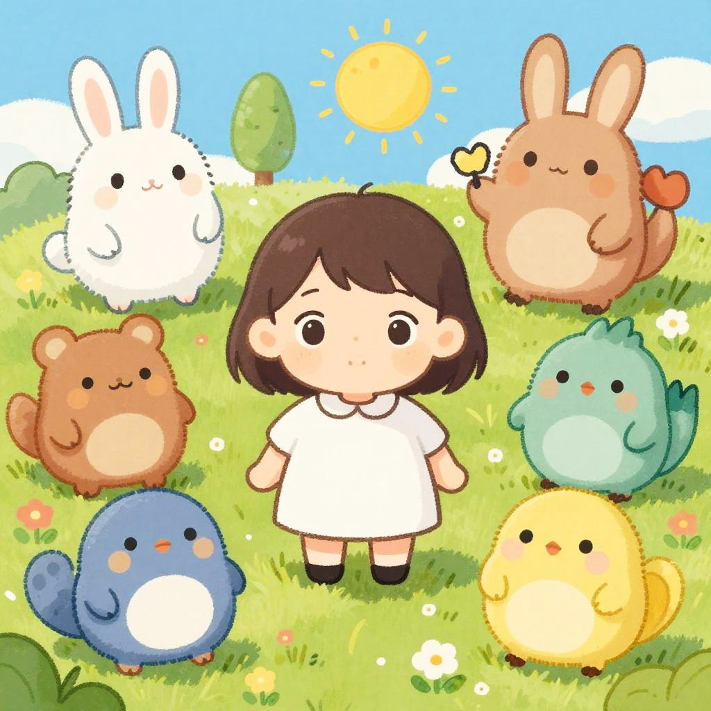 Whimsical kodomo art style depicting a fantasy world filled with magical creatures, bright saturated hues, naive drawing style with expressive eyes and soft edges, playful and heartwarming