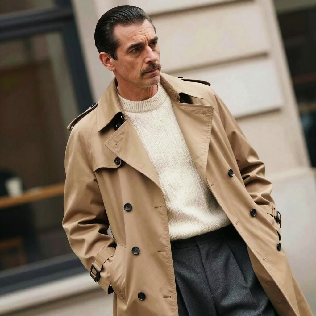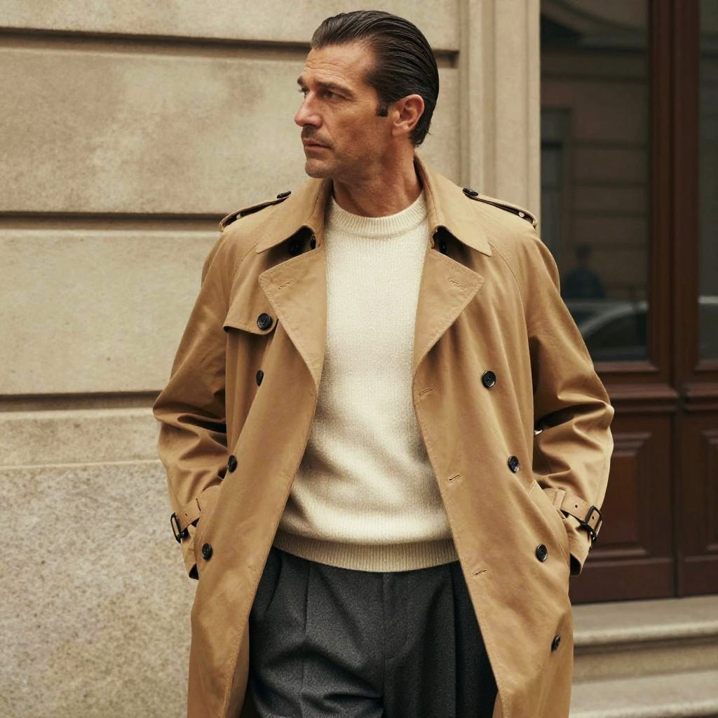 Man in Camel Trench Coat and Cashmere Sweater