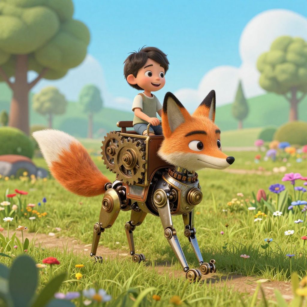 In a whimsical 3D-rendered scene, a mechanical fox powered by kinetic gears carries a smiling child through a vibrant meadow, blending steampunk aesthetics with natural beauty in a high-definition, animated fantasy world.