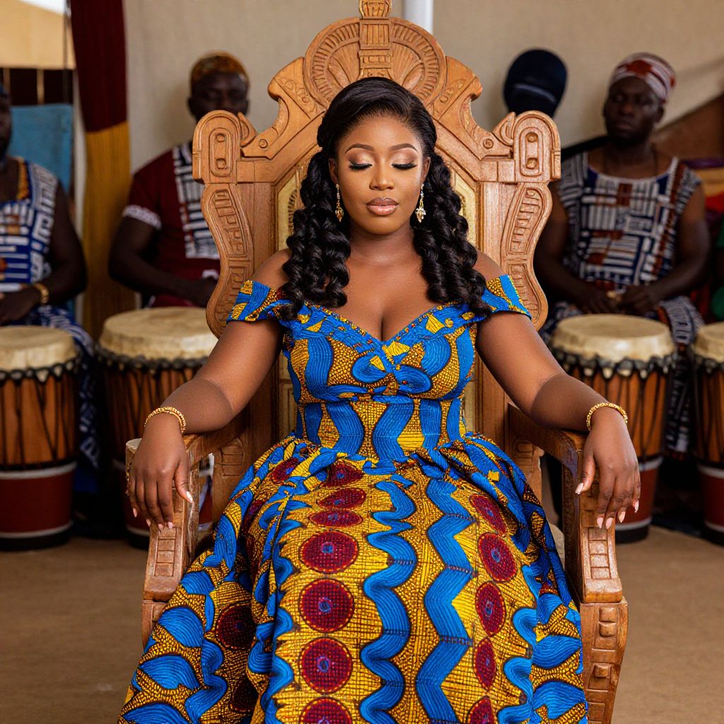 A breathtaking Ghanaian Kente Queen costume portrait of a beautiful woman with dark, wavy hair styled in large braids, wearing a full ceremonial Kente dress with vivid, traditional bright woven patterns in blue, gold, and crimson, seated on a royal throne made of carved wood in a traditional marketplace, her face glowing with wisdom and elegance, eyes closed in calm authority, surrounded by fans and ceremonial drums in the background.. The woman has big tits and cute face