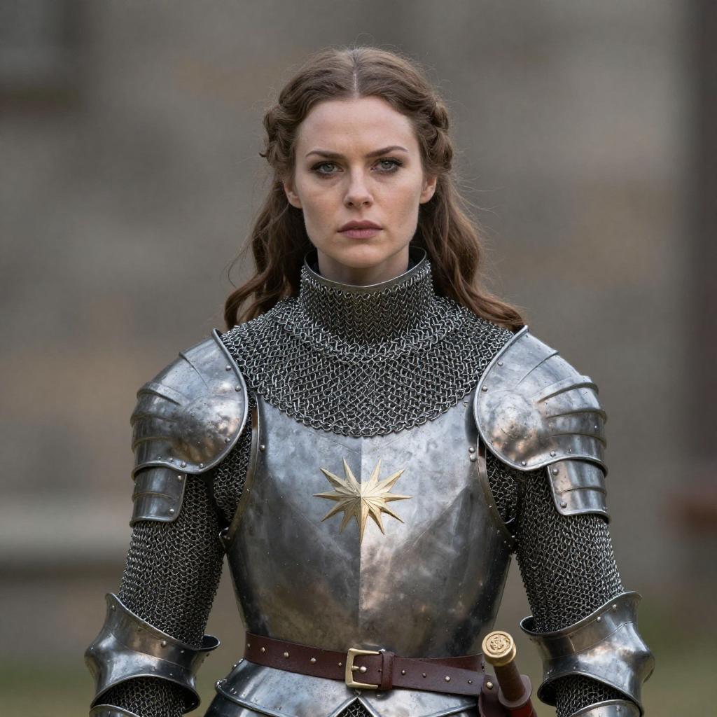 Portrait of a woman wearing detailed medieval armor with chainmail and metal shoulder plates, featuring a golden star emblem on the chest plate. She has long wavy brown hair and a strong, focused expression, evoking a fantasy knightly style inspired by the Excalibur legend.