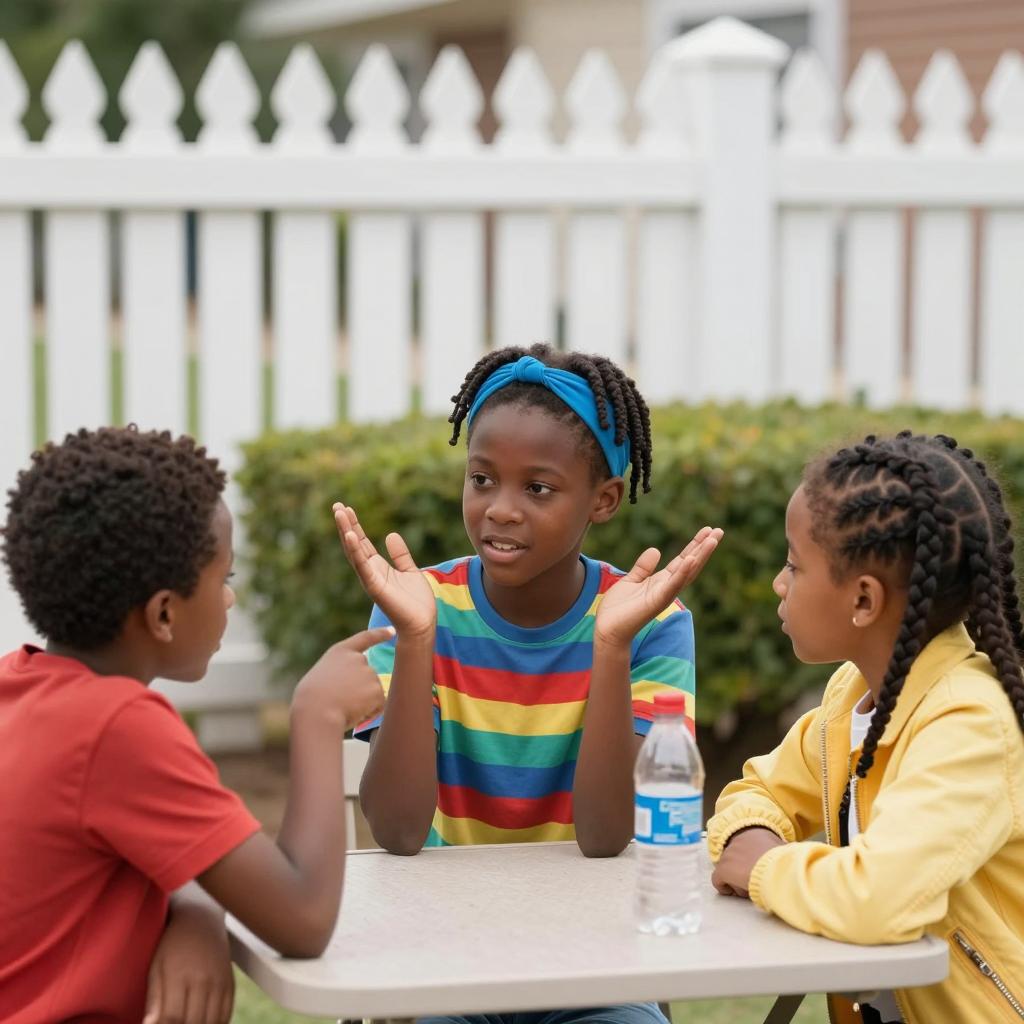 Three African-American children sitting at an outdoor table with a white picket fence in the background. The boy on the left has short curly hair, wears a red shirt, points at the middle child. The middle child has a blue headband, braided hair, colorful striped shirt, gestures with hands. The girl on the right has long braided hair, wears a yellow jacket, looks at the middle child. A plastic bottle is on the table. Green bushes behind the fence. All children face each other.