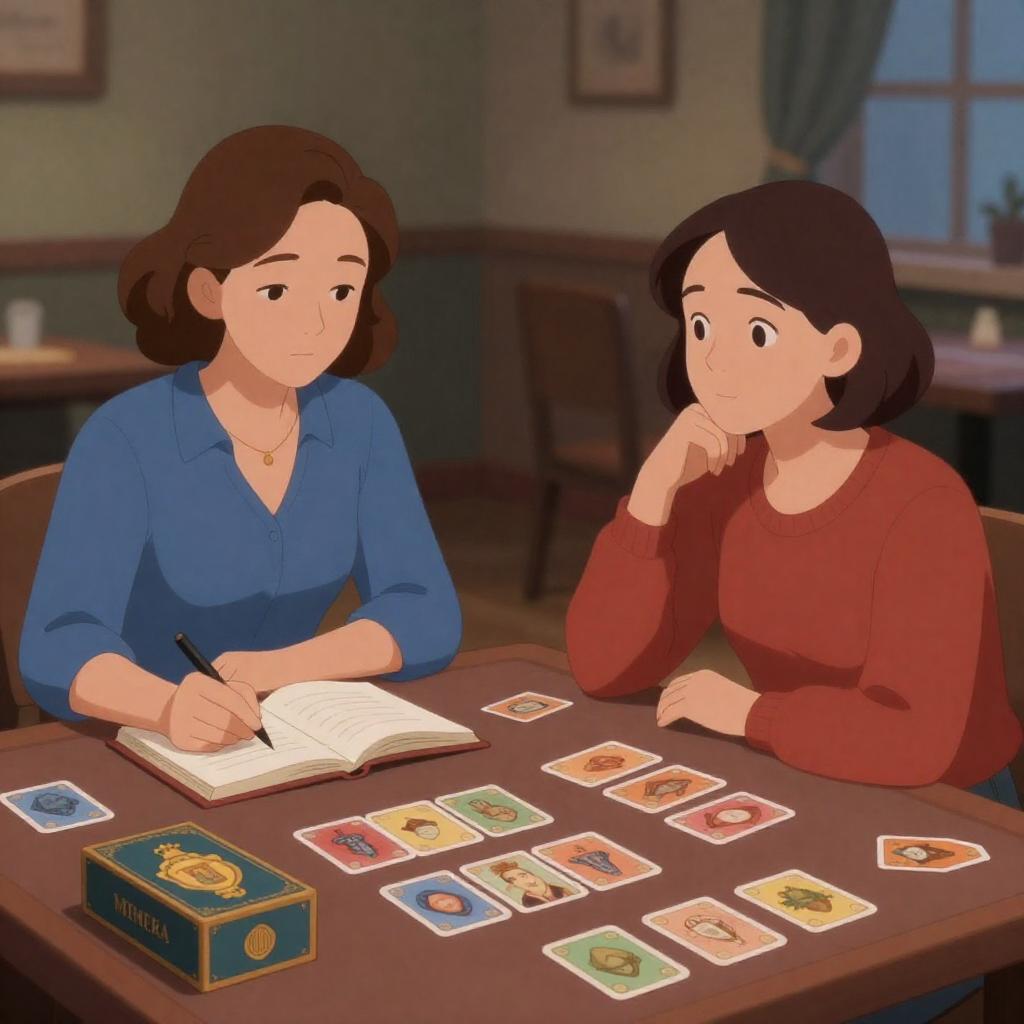 Illustration of two women at a card table. Woman on left with curled brown hair, blue blouse, writing in open book. Woman on right with short brown hair, red sweater, resting chin on hand, looking up. Card game with "Temple for Minerva" box on table. Background: dimly lit room with chairs and windows.