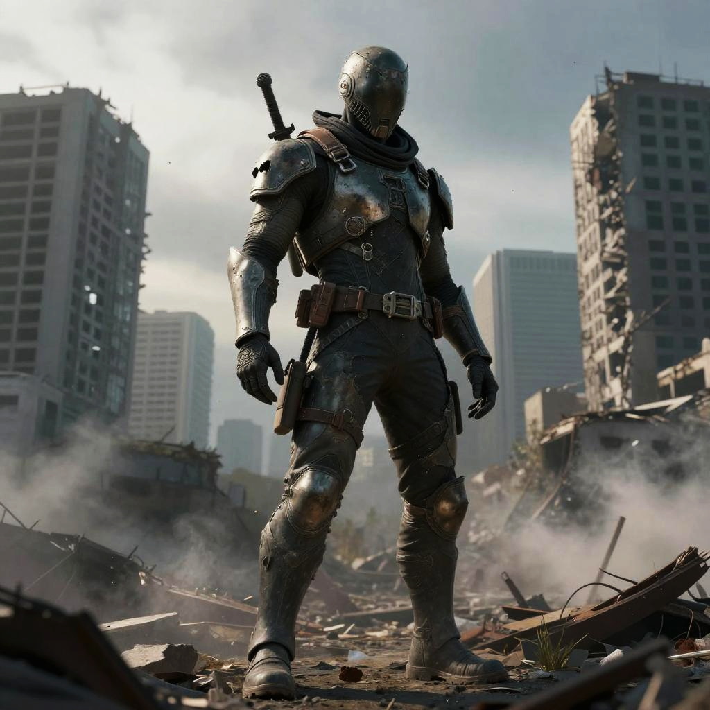 Dystopian uniform in a post-apocalyptic setting, torn and armored, worn by a lone survivor scavenging ruins, smoky skies and ruined skyscrapers, dramatic lighting