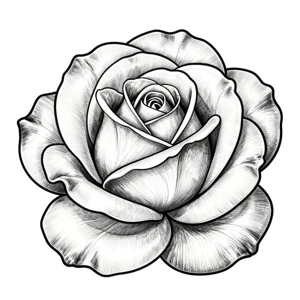 Realistic rose coloring pages presenting a close-up view of a single rose blossom with layered petals, detailed texture, and natural curves, designed for precision coloring with shading hints to guide colorists in achieving depth and realism.