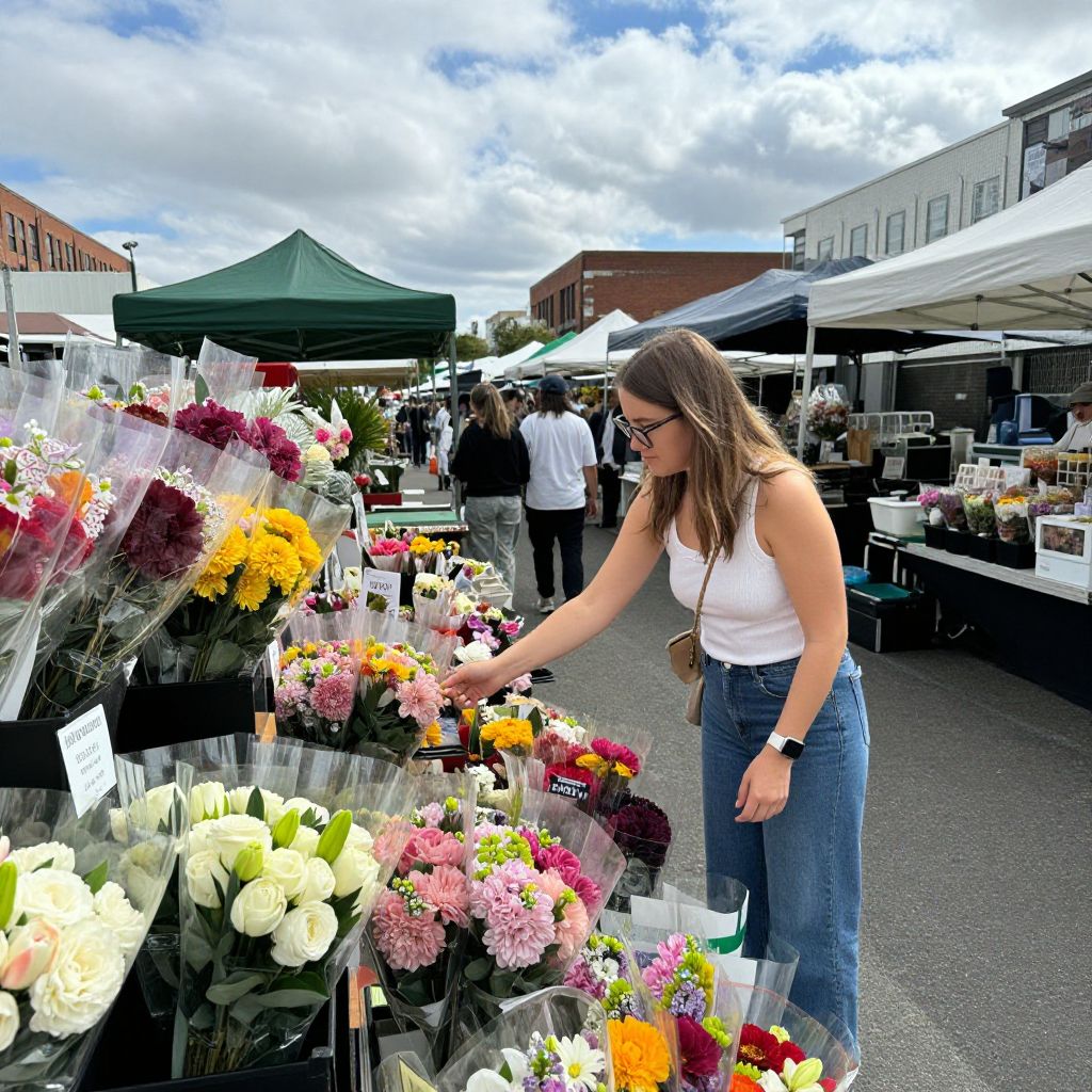 Woman exploring vibrant flower stalls at Columbia Road Flower Market, surrounded by colorful blooms and bustling activity under a partly cloudy sky.