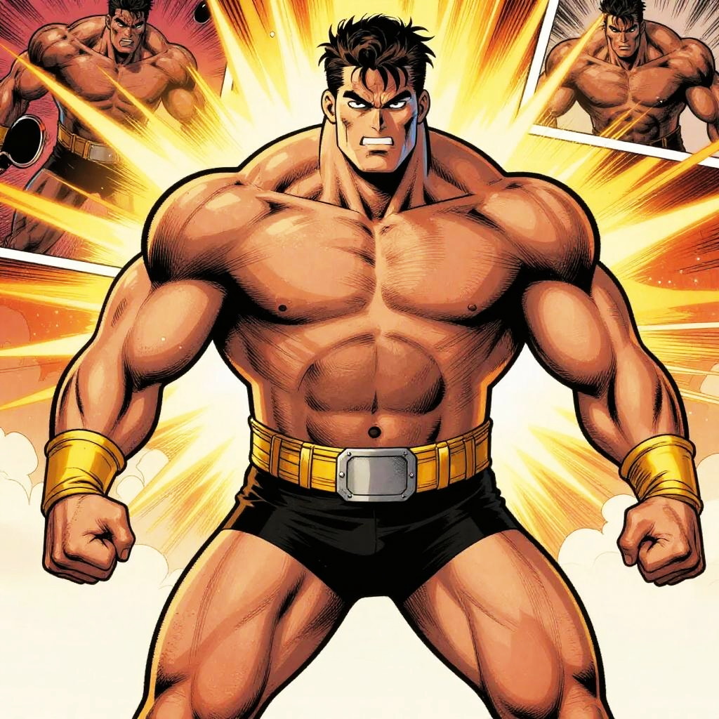 Digital anime-style drawing of two muscular superheroes in a neon-lit city: one with blond hair in a black-red suit, other with black hair in