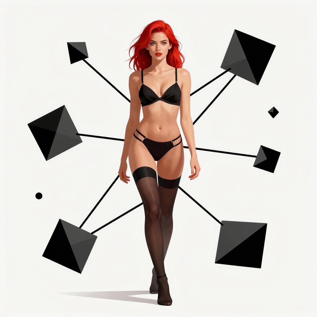 Digital illustration of a red-haired woman wearing black lingerie and thigh-high stockings. She stands confidently against a light background, surrounded by floating black geometric shapes connected with thin black lines, creating a futuristic and abstract atmosphere.
